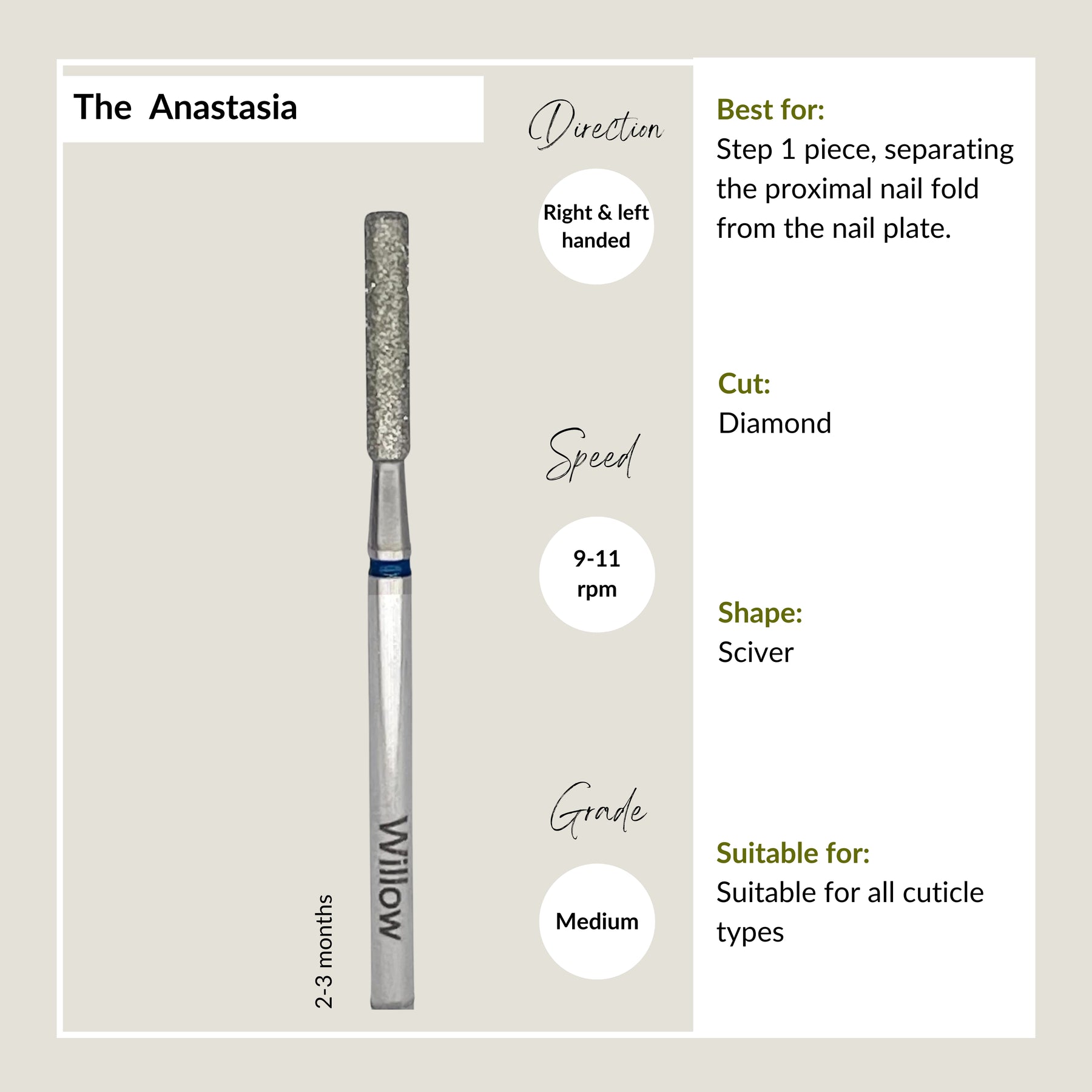 One of our best sellers - the "Anastasia" is the perfect shape for separating the proximal nail fold in place of the cuticle pusher. The flat tip and edge is the perfect shape to separate the skin from the nail plate and reach down into the side walls.