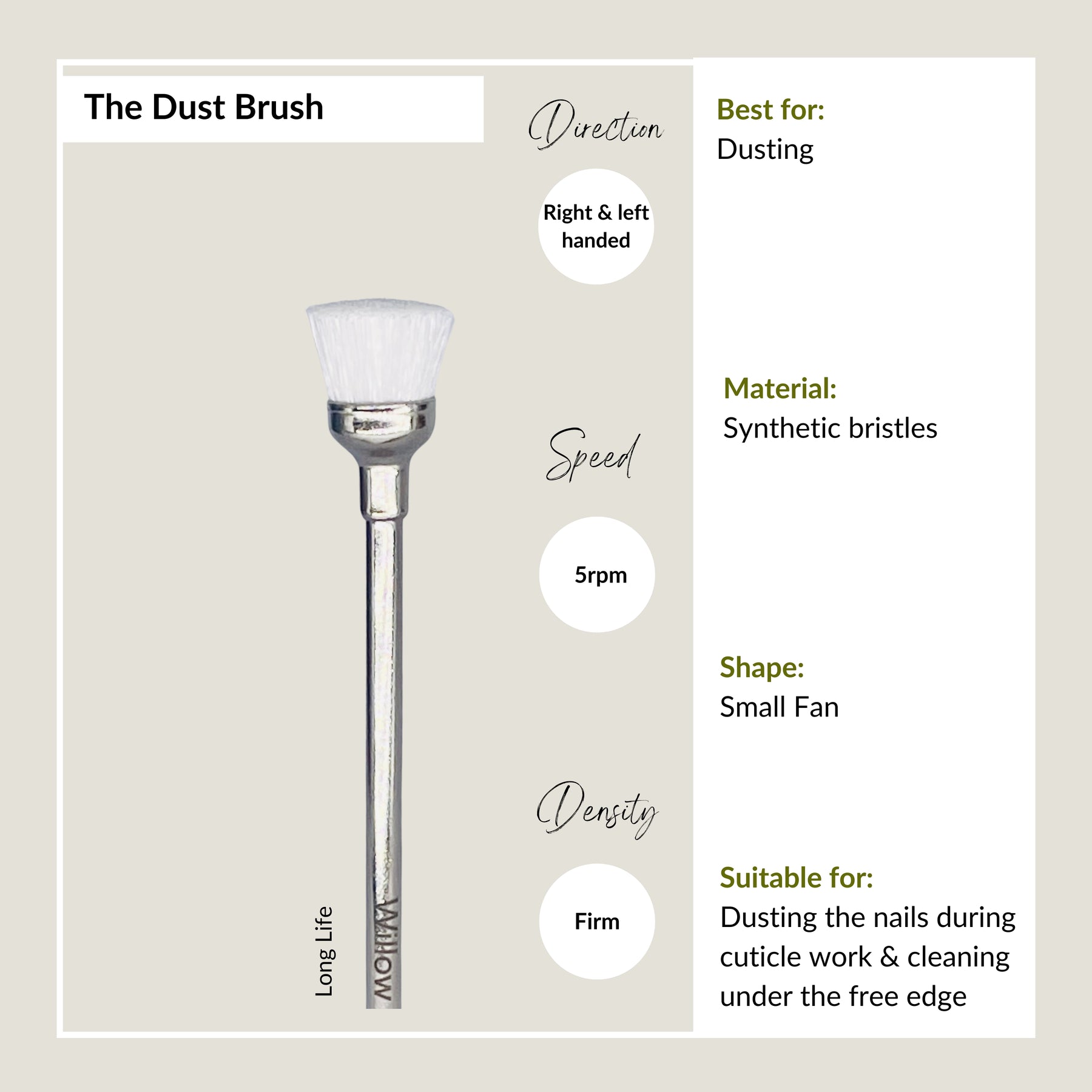 This dust brush bit cleaner is perfect in aiding you in your cuticle work. On many occasions we can mistake lodged dust for more skin, as our usual hand dust brush may be too bulky to get in around those hard to reach areas. On a speed of 5rpm due to its tiny nature and rotation a clean prep is achieved.