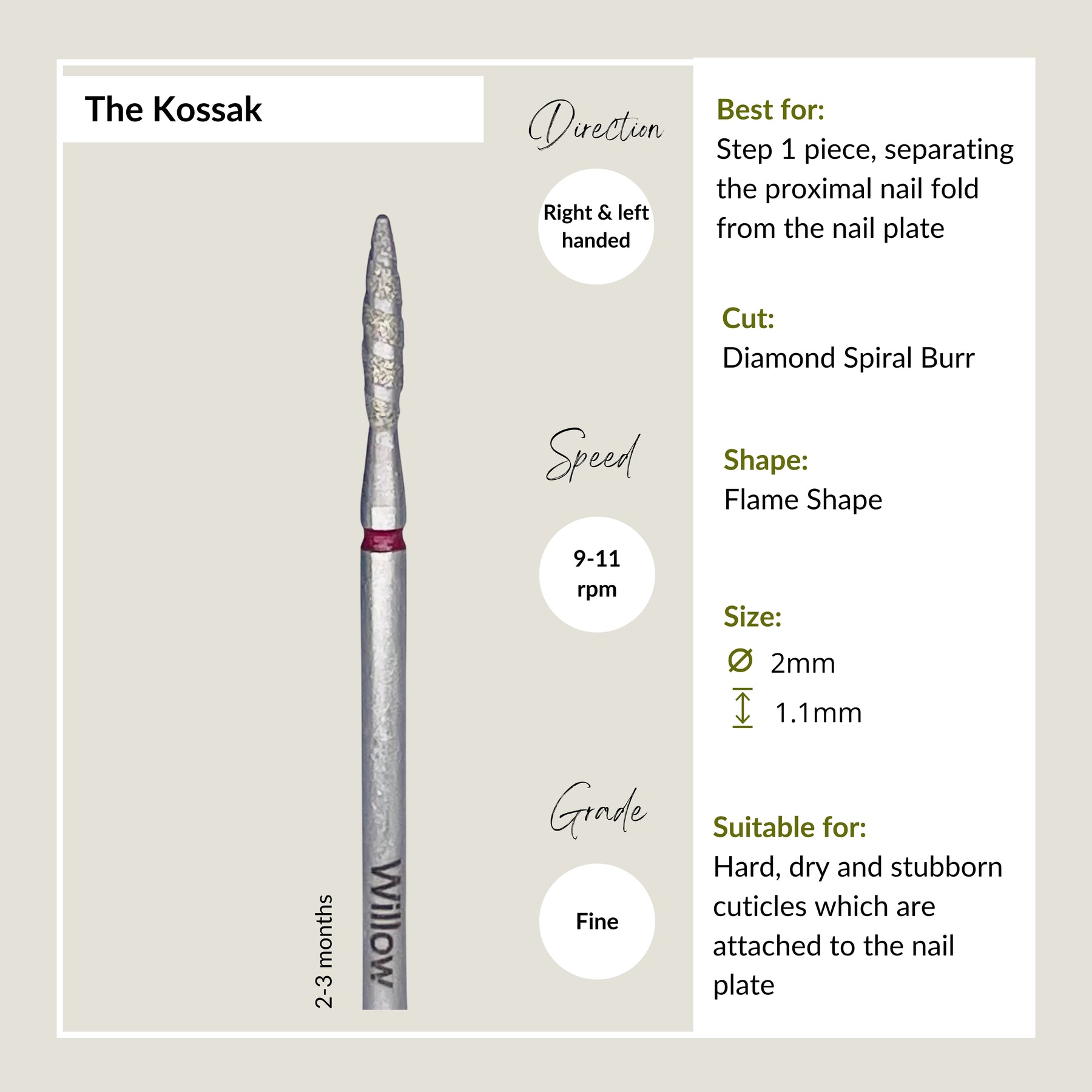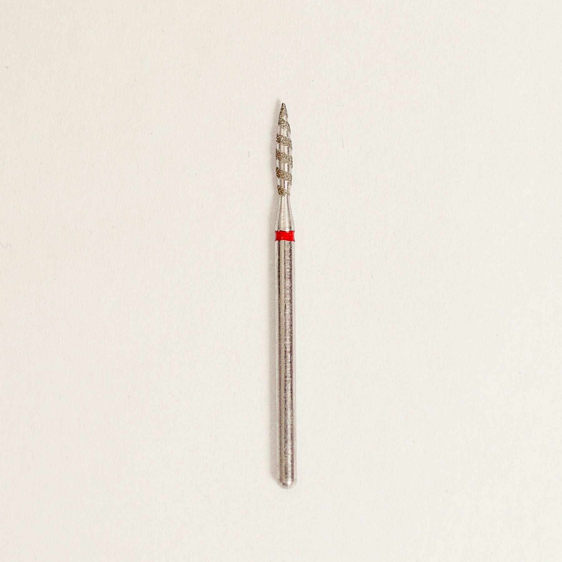 This flame piece with a twisted diamond burr is popular for a reason. Perfect for separating the proximal nail fold from the nail plate. Slightly longer in size & sharper in point than "The Flame".