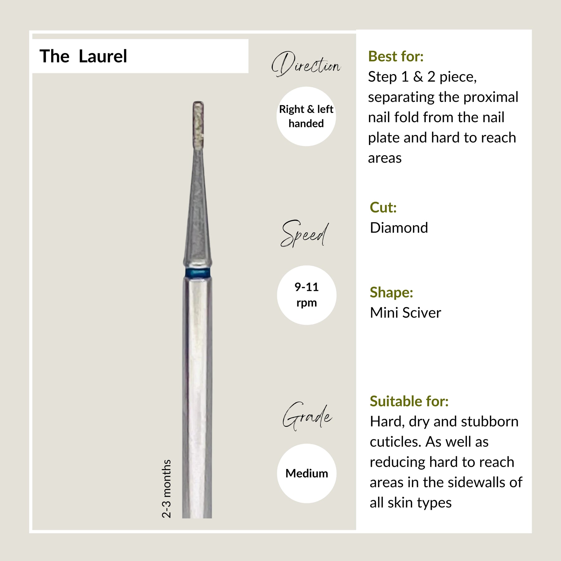 It's super popular for its "Mini-Anastasia" look. It can be used as a step 1 piece to separate the cuticle from the nail plate or as a step 3, for reaching the difficult areas at the end of your prep routine.