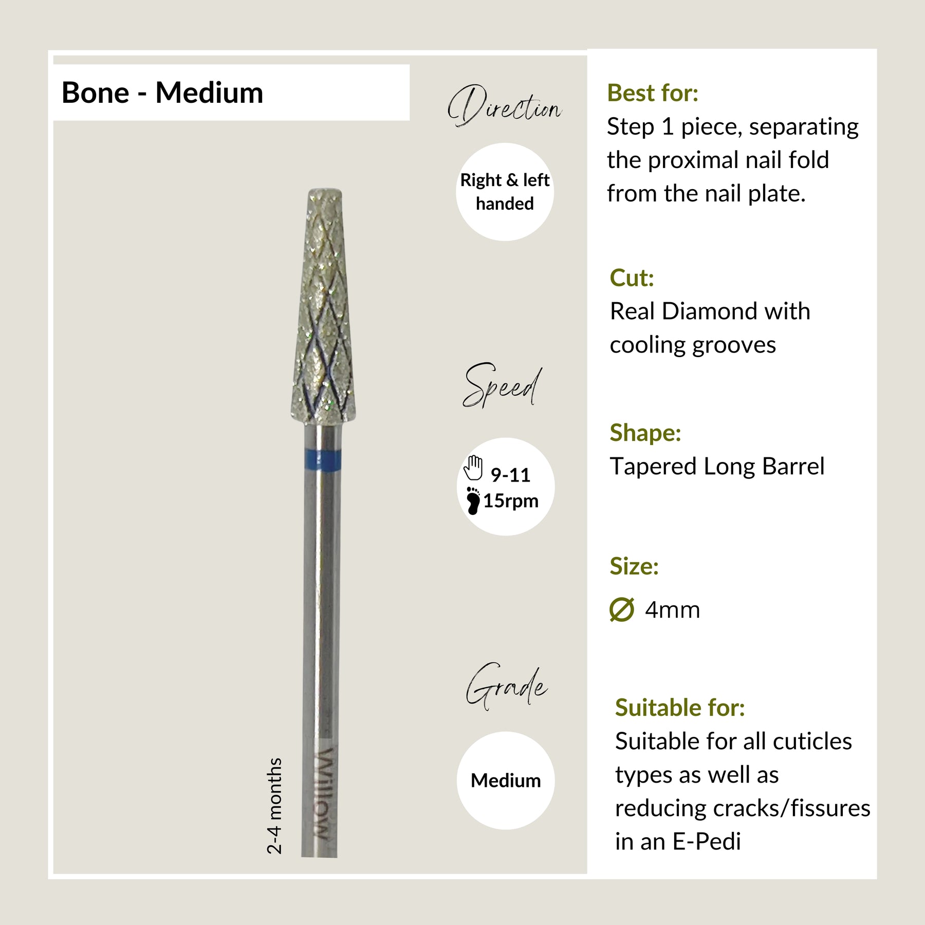 This long tapered barrel piece is the perfect shape and size for removing pterygium, lifting the nail fold and reducing cracks & Fissures of the foot. It also great for reducing calluses as its length covers larger areas.