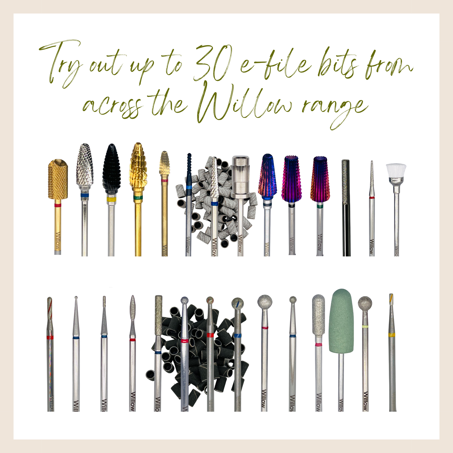 You will be able to use up to 30 different Willow E-file bits, so that you will find the pieces that work best for you.