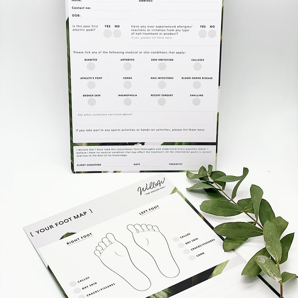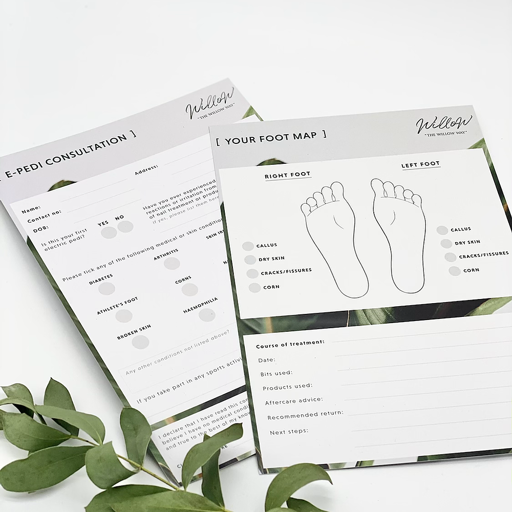 The Willow E-pedi Consultation Cards are designed for your convenience. Measuring A5 and sold in packs of 20, they are printed on high-quality 350gsm card, providing an ideal surface for note-taking. These indispensable cards include all the necessary sections for you to fill out, ensuring an organised and efficient consultation process.
